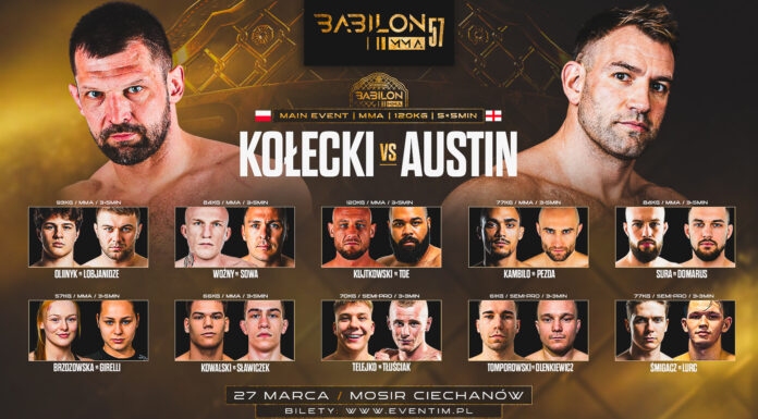 Znane są już wszystkie zestawienia gali Babilon MMA 57. W piątek 27 marca w Ciechanowie kibice zobaczą hitowe starcie Szymon Kołecki vs Stuart Austin o mistrzowski pas w wadze ciężkiej, a wcześniej w klatce zaprezentują się "Młode Wilki Babilonu"...